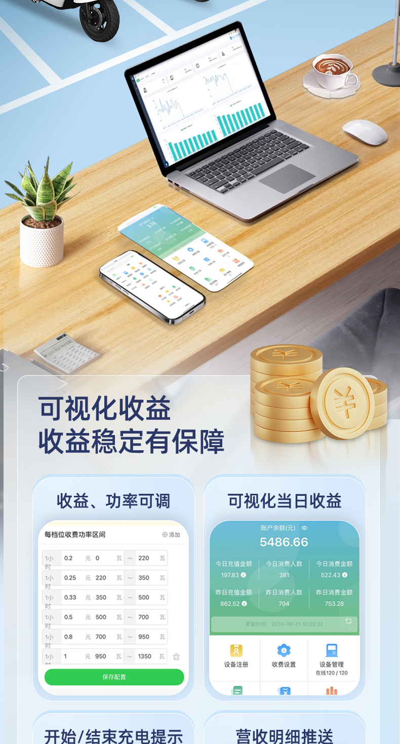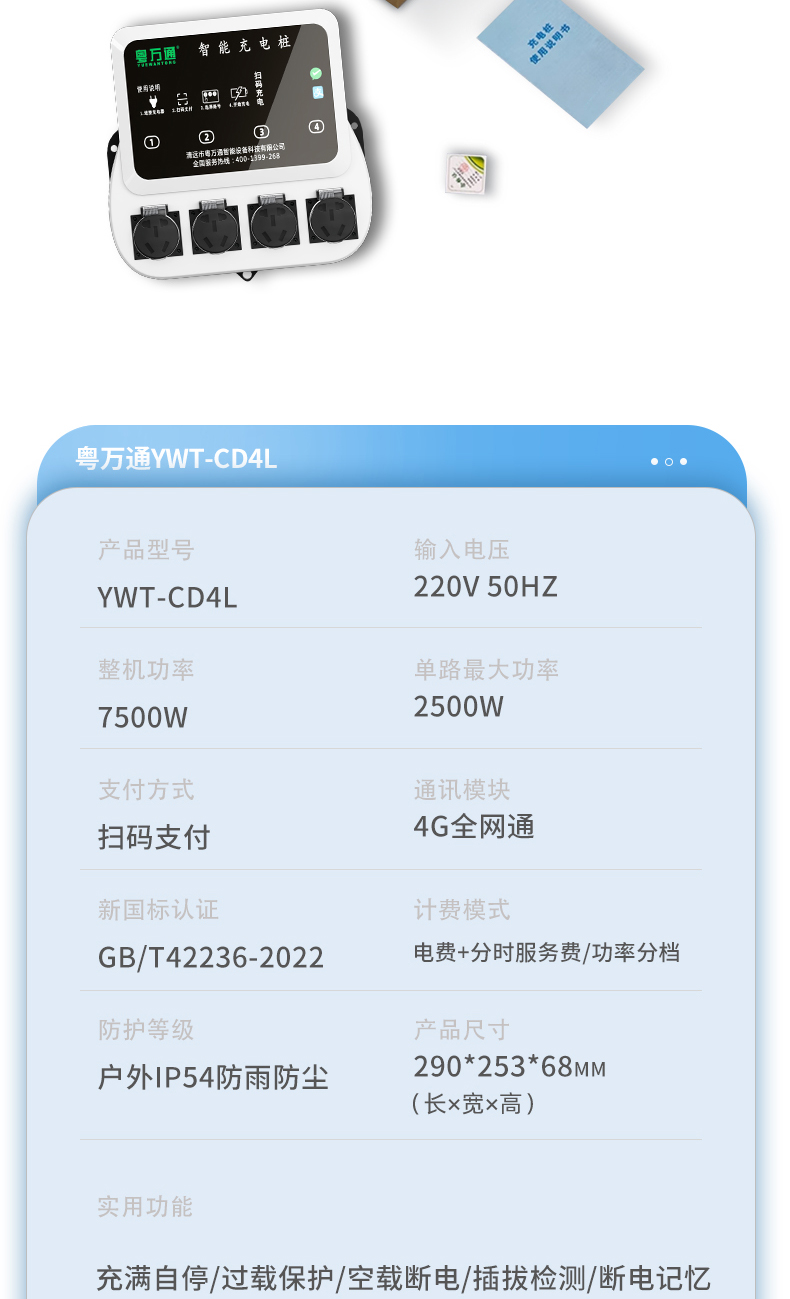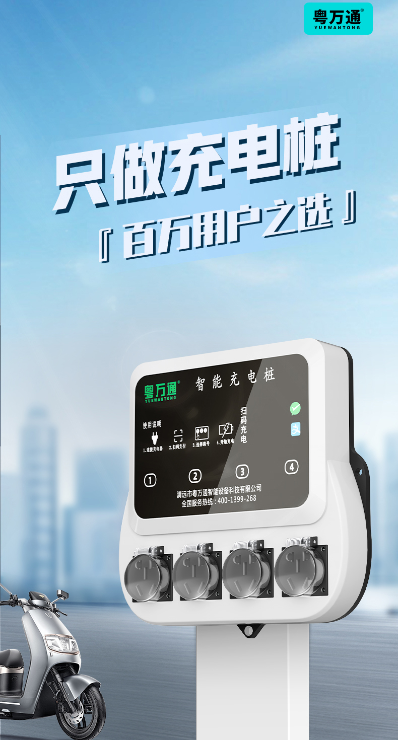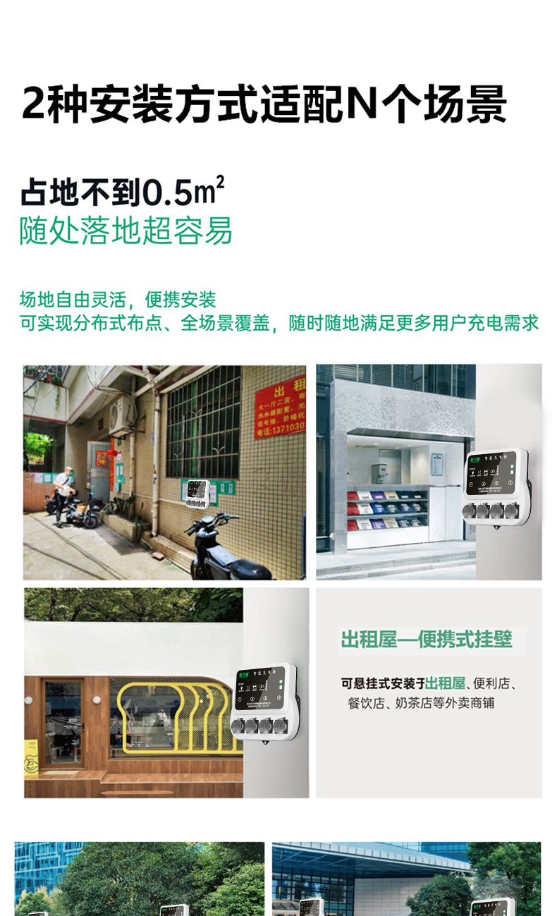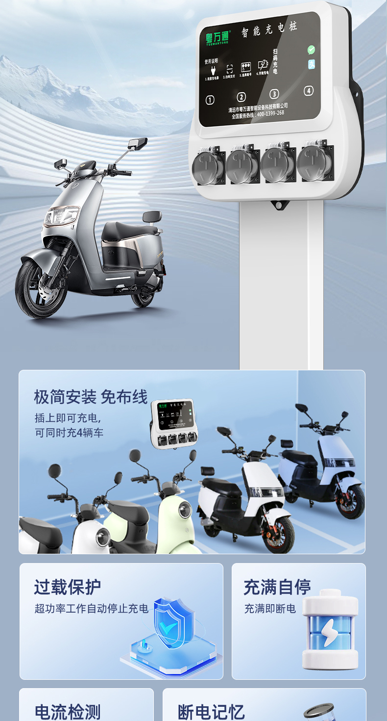 4路电瓶车充电桩插座 智能扫码 免布线 安装省心省力,单路最大支持2500瓦大功率输出,可以充两轮电瓶车、电动三轮车、老头乐等